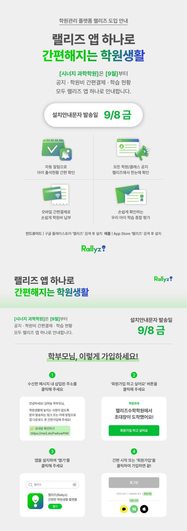 시너지 과학학원은 9월 8일(금)부터 랠리즈 어플을 통해 출석 알림과 비대면 간편결제, 각 클래스별 학습 현황 안내등을 시행합니다.